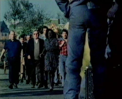 In other words, reports by the world's media had missed significant aspects of the momentous struggles in Poland, and so the creation of Solidarity could only be brought to the screen with the aid of dramatic reconstructions of key moments. Strike's origins in recent events are clear from the outset: the programme begins with amateur footage of a protest held at the Lenin shipyard in 1979. The memories of shipyard workers who were killed in a clash with police during a previous strike, nine years earlier, are being honoured by the protesters. As the narrator emphasises, 'these people, followed by millions across Poland, will mount an unprecedented challenge to the Soviet order in Eastern Europe, igniting the most serious European crisis since World War Two.'