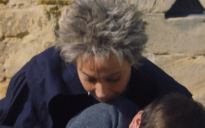 Inside the house, she kicks a brick at the bomb. It begins to tick ominously. Mrs Tachyon imitates the sound, eyes filled with sadness, and makes no attempt to escape. Perhaps she knows that no-one in this small, war-torn community would've been able to diffuse the bomb. Perhaps she knows that no-one else could hope to survive the blast. While the eccentric bag lady often provides comic relief, here she's a deeply poignant figure.