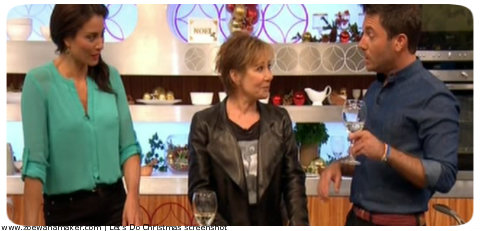 Zoë was the special guest on this lunchtime's episode of ITV's culinary-themed, festive chat show, Let's Do Christmas... With Gino & Mel. She joined the presenters, chef Gino D'Acampo and Melanie Sykes, in the kitchen to help prepare seasonal dishes.